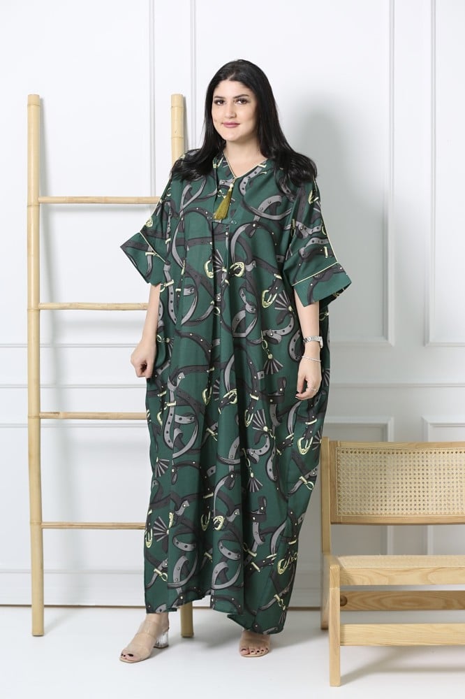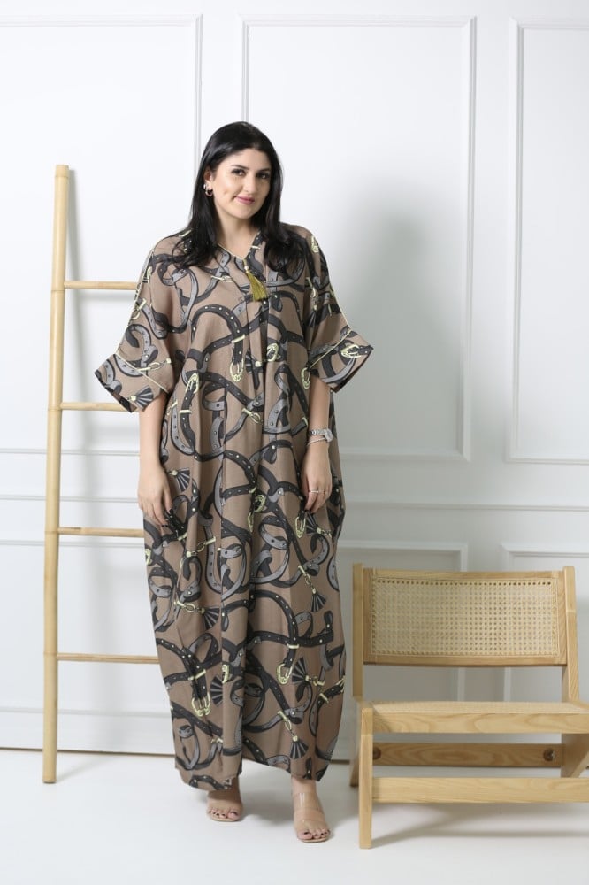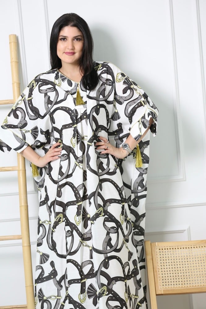 ثوب كتان مزين بنقوش مميزة كم قصير فري سايز